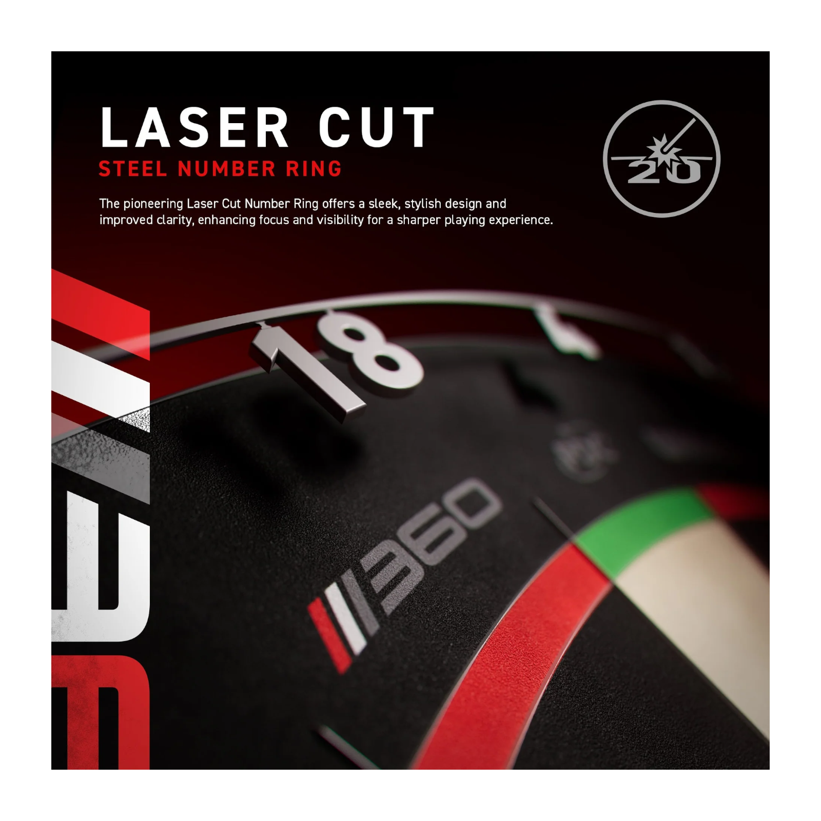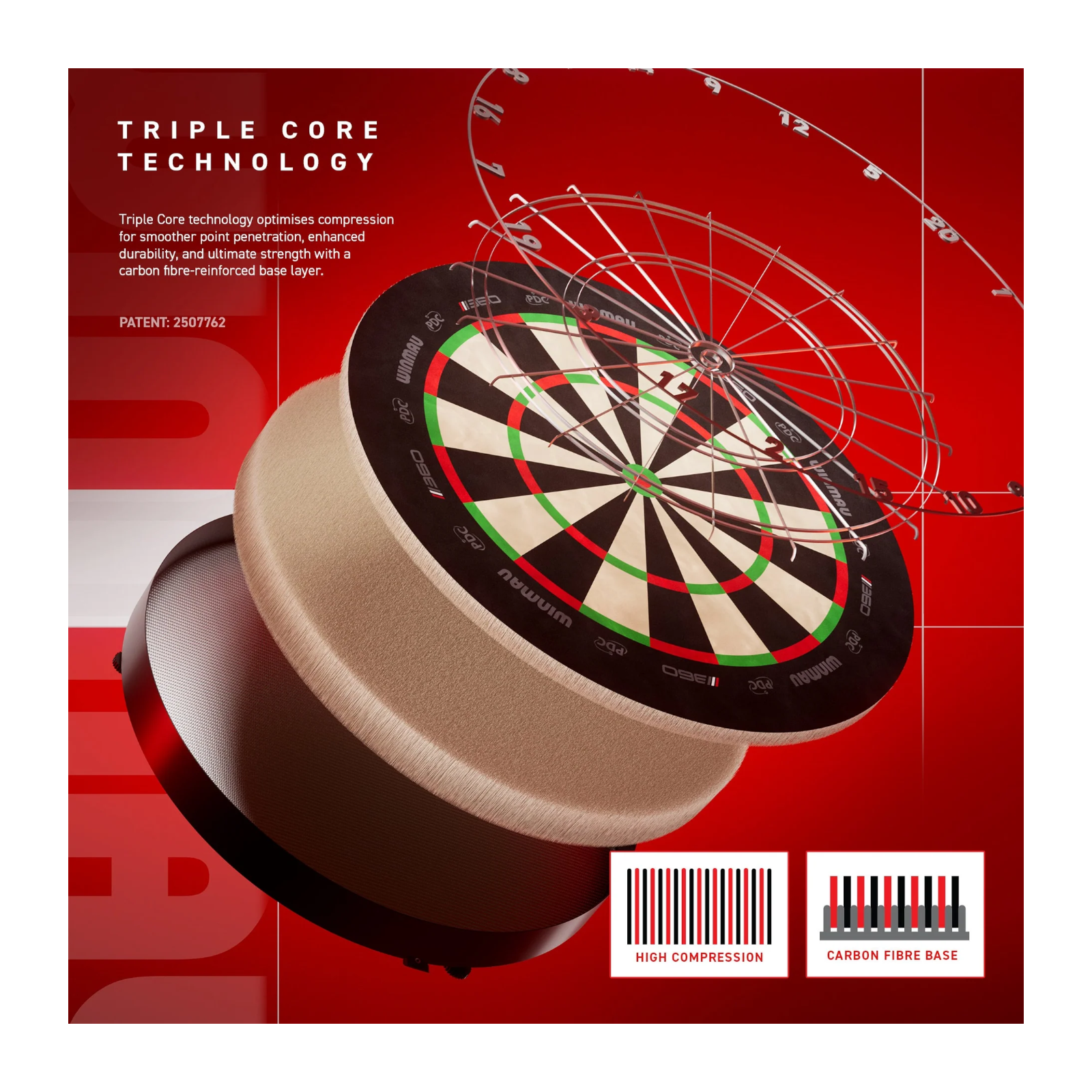 Die patentierte Mehrschicht-Konstruktion mit carbonverstärktem Kern sorgt für maximale Stabilität, optimale Faserdichte und ein angenehm weiches Eindringen der Darts.
