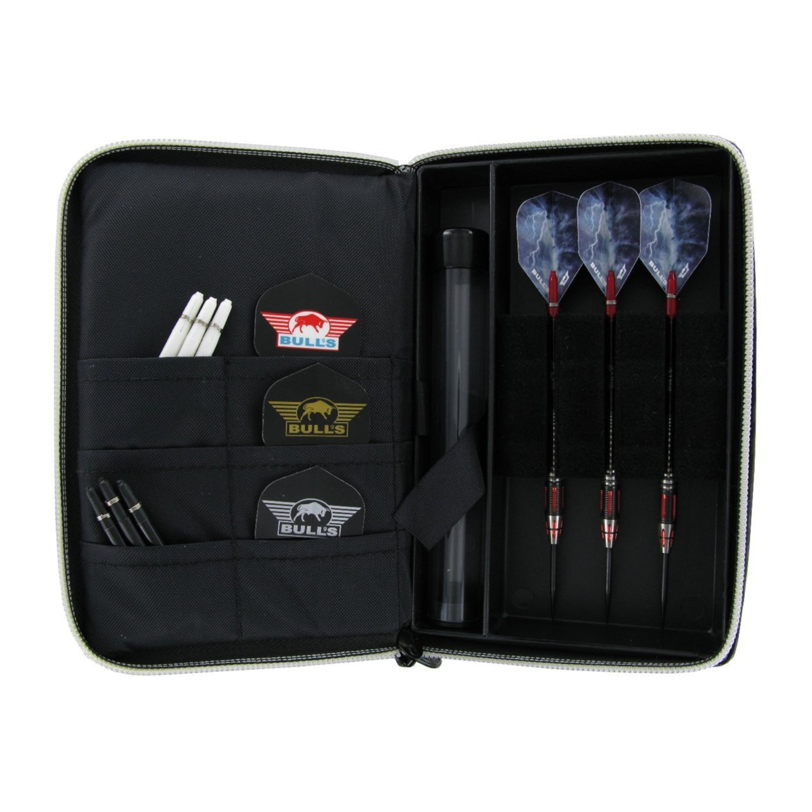 Im Inneren bietet das Case ausreichend Platz für ein komplett montiertes Dart-Set sowie zusätzliches Zubehör wie Flights, Shafts, Spitzen oder Tools. Durch die durchdachte Innenaufteilung bleibt alles ordentlich verstaut und jederzeit griffbereit. Der stabile Reißverschluss sorgt für einen sicheren Verschluss, während das kompakte Format problemlos in jede Tasche passt.